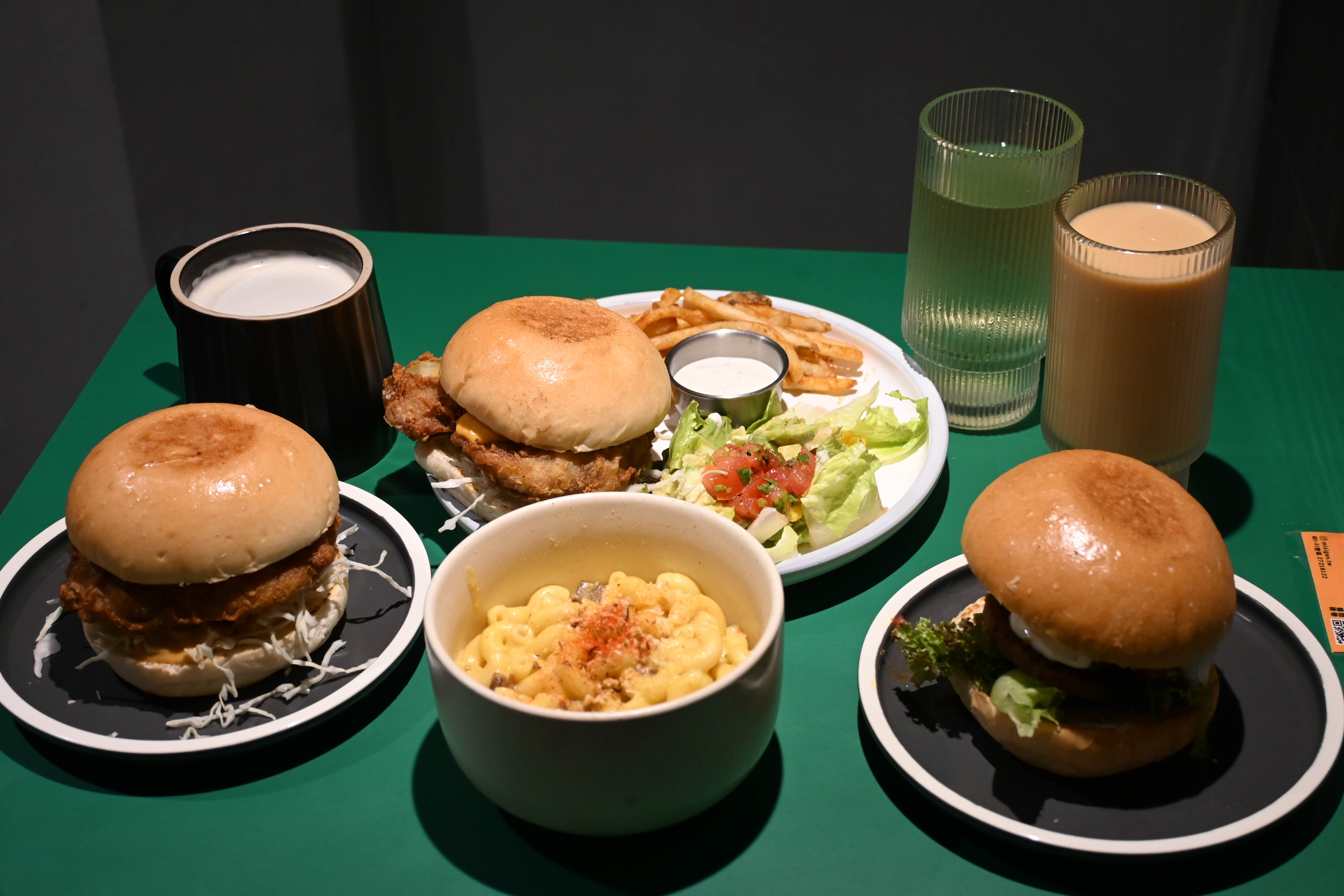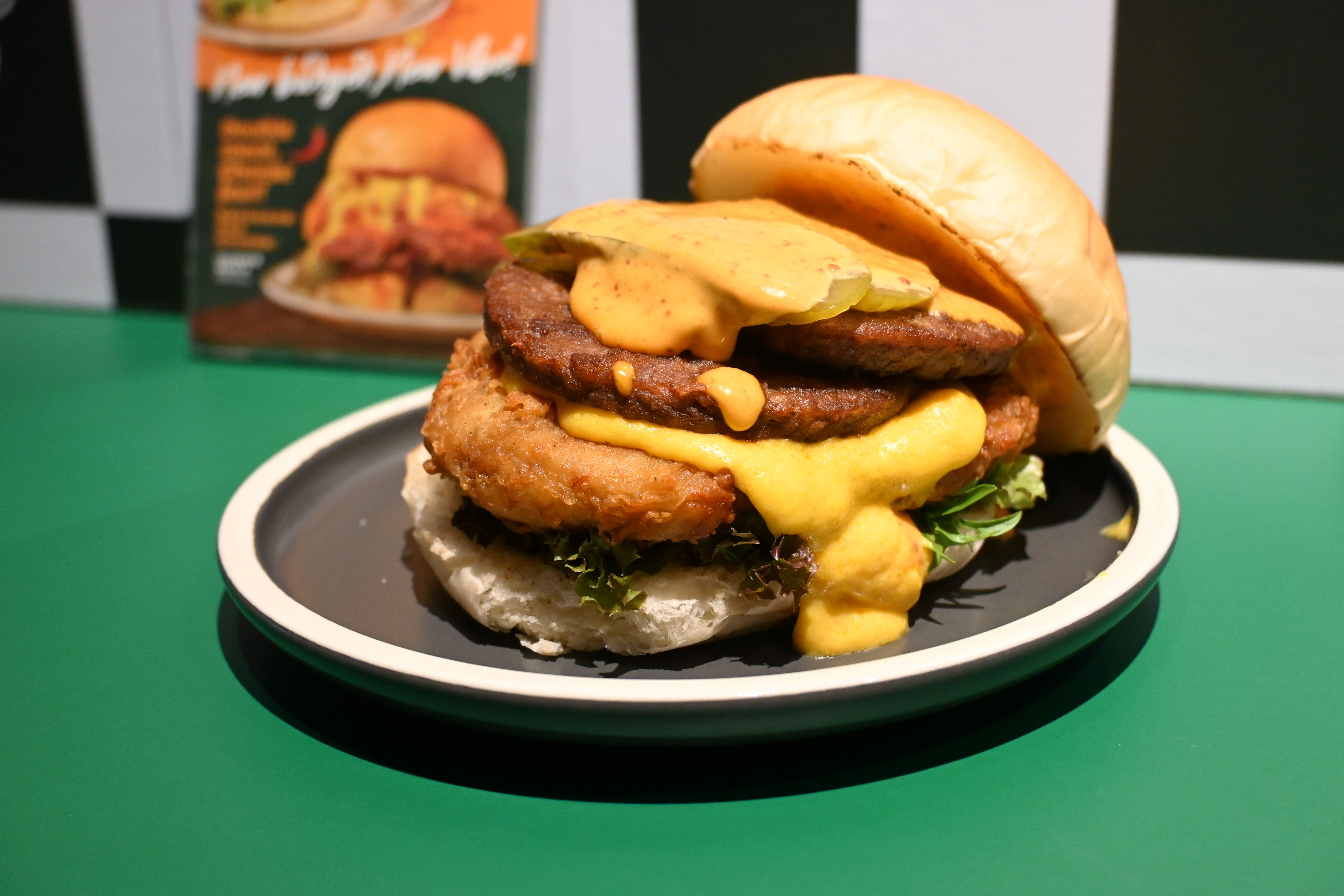 兩人異口同聲首推「BBQ 神級牛雞雙全霸王堡」,不只是他們個人最愛,也是目前最熱門的品項之一。Eric 生動分享:「牛雞只有爽囉。太好吃了,真的。」當然,這邊的牛、雞並不是葷食,而是由植物肉、杏鮑菇等蔬食食材製作而成。針對食量比較小的顧客,Carrie 則大推吉事雙層牛肉漢堡。