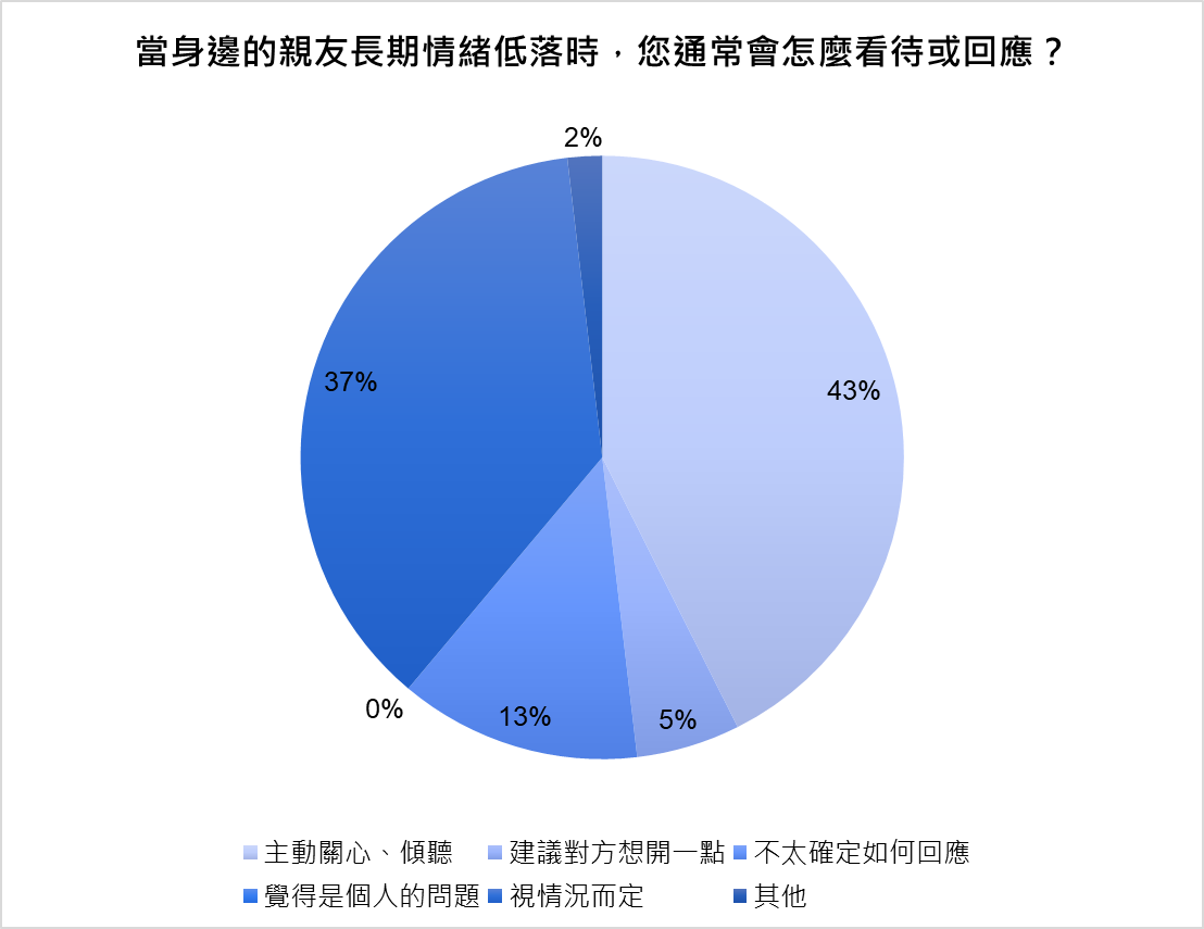 如果身邊親友出現上述憂鬱症成因的症狀,多數受訪者傾向採取「主動關心、傾聽」的正面作為,身邊人的支持是目前主流的回應方式,也有約37%的人認為須視情況而定,以及有約13%的受訪者表示自己並不是很了解碰到這樣的情況,該如何應對。這也是未來政府在推廣憂鬱陪伴的議題時,值得關注的地方。