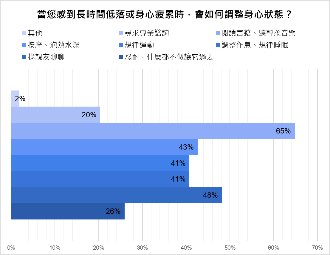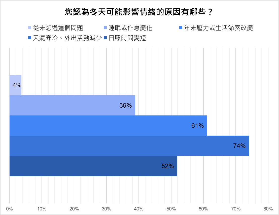 同樣地,提到關於冬季情緒波動的三大主因,有七成以上的受訪者認為可能是因為天氣寒冷、外出減少導致情緒不佳(74.1%),其次是因為年末壓力或生活節奏改變(61.1%),也有一半的受訪者認為與光照時間變短相關。也有近四成的人認為冬季的睡眠或作息變化也會影響情緒。