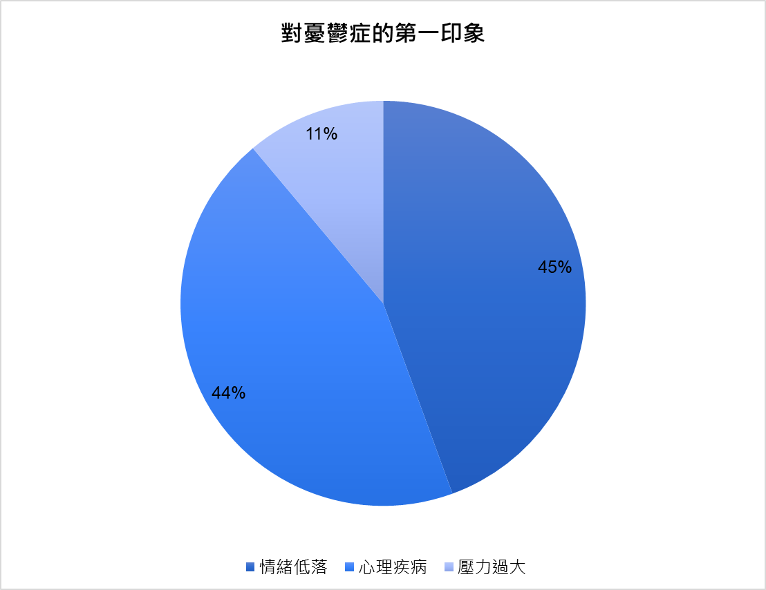 多數人的第一印象主要集中在「心理疾病」與「情緒低落」,兩者比例相當(約44.4%)。這顯示大眾多半能從醫學或心理層面來看待憂鬱症。問卷顯示約有四成的人已將憂鬱症視為醫學上的「疾病」,而非單純的「心情不好」。