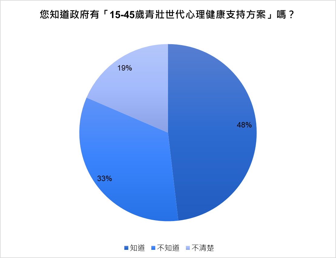 憂鬱症重要嗎?這項議題獲得了極高的共識,88.9%的人認為季節性憂鬱與憂鬱症是值得被大眾重視的議題,衛福部也設有「15-45歲青壯世代心理健康支持方案」,補助每人3次心理諮商費用,但有一半以上的受訪者(51.9%)不清楚或是完全不知道此方案。顯見政府在推動心理健康支持方案的認識,仍有極大的進步空間。